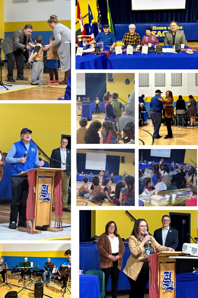 On January 12, 2023, St. Louis Public School, in partnership with the Metis Nation of Saskatchewan, hosted a Michif New Years celebration. Our gym was full as we enjoyed an evening of traditional food and entertainment. Fiddle Memories provided music while we visited and ate, and the highlight was when our PreK/K students sang to us in Michif and demonstrated the Rabbit Dance they have been practicing. We would like to thank our Elders, Sophie McDougall, Doris McDougall, Sonny Vandale, and Phyllis Vermette for attending as well as the many dignitaries who spoke to us. These include MNS President Glen McCallum, WR2 Director Sherry McLennan, Metis Local #28 President Lucille Tetarenko, Christine Tienkamp of the River Women Collective, and SRPSD Director Robert Bratvold. We would also like to acknowledge the support of MNS in making this event possible.